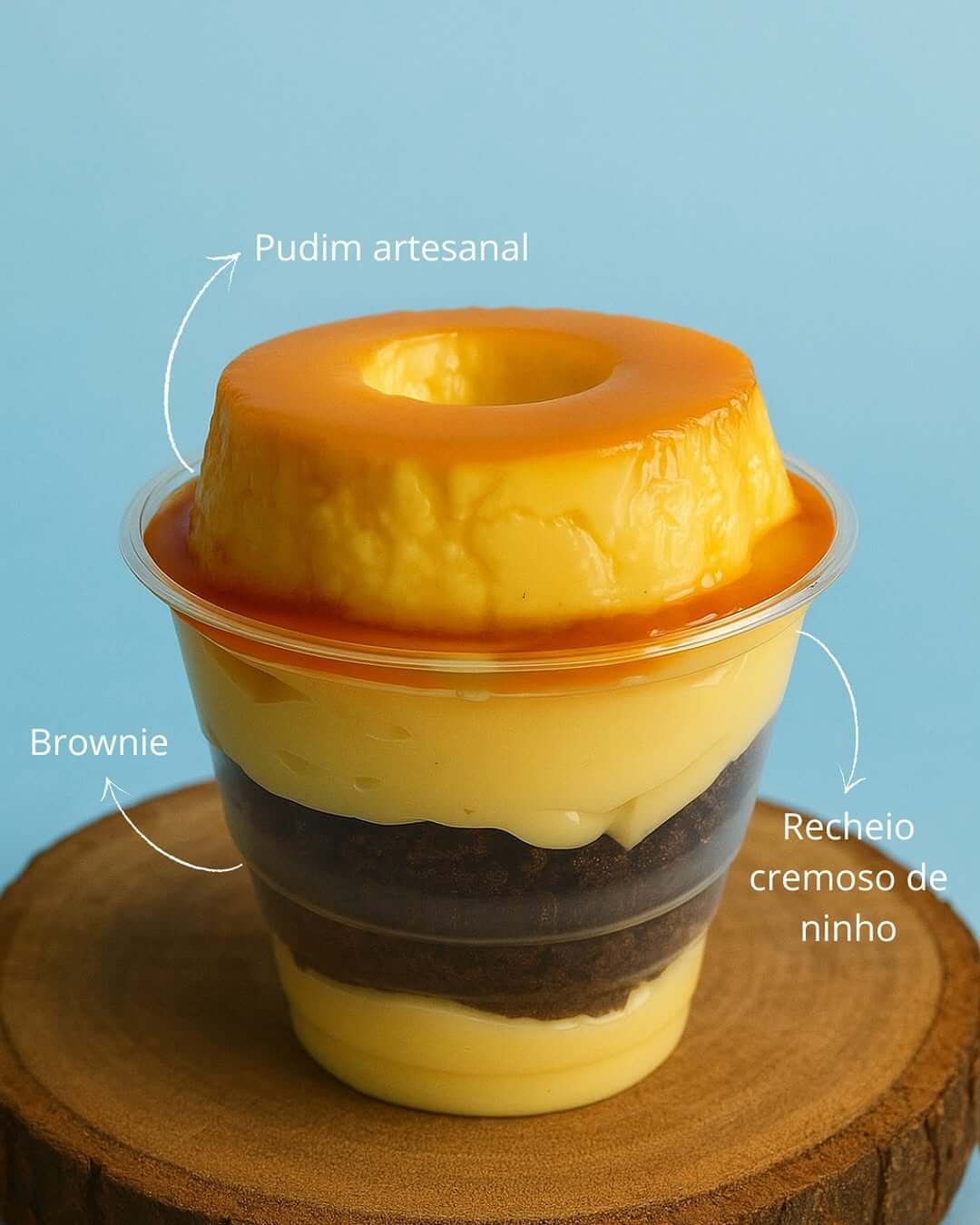 Copo recheado com brigadeiro cremoso de ninho, pedaços do nosso delicioso brownie, e finalizado com pudim artesanal de dar água na boca. 250g de equilibrio e sabor.